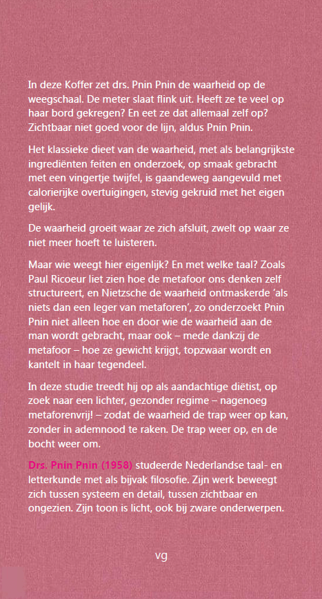 ‘In deze Koffer zet drs. Pnin Pnin de waarheid op de weegschaal. De meter slaat flink uit. Heeft ze te veel op haar bord gekregen? En eet ze dat allemaal zelf op? Zichtbaar niet goed voor de lijn, aldus Pnin Pnin.