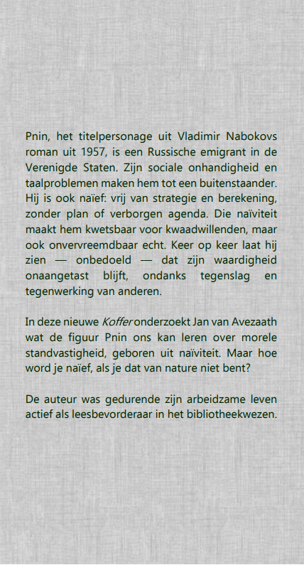 In deze nieuwe Koffer onderzoekt Jan van Avezaath wat de figuur Pnin ons kan leren over morele standvastigheid, geboren uit naïviteit. Maar hoe word je naïef, als je dat van nature niet bent?
