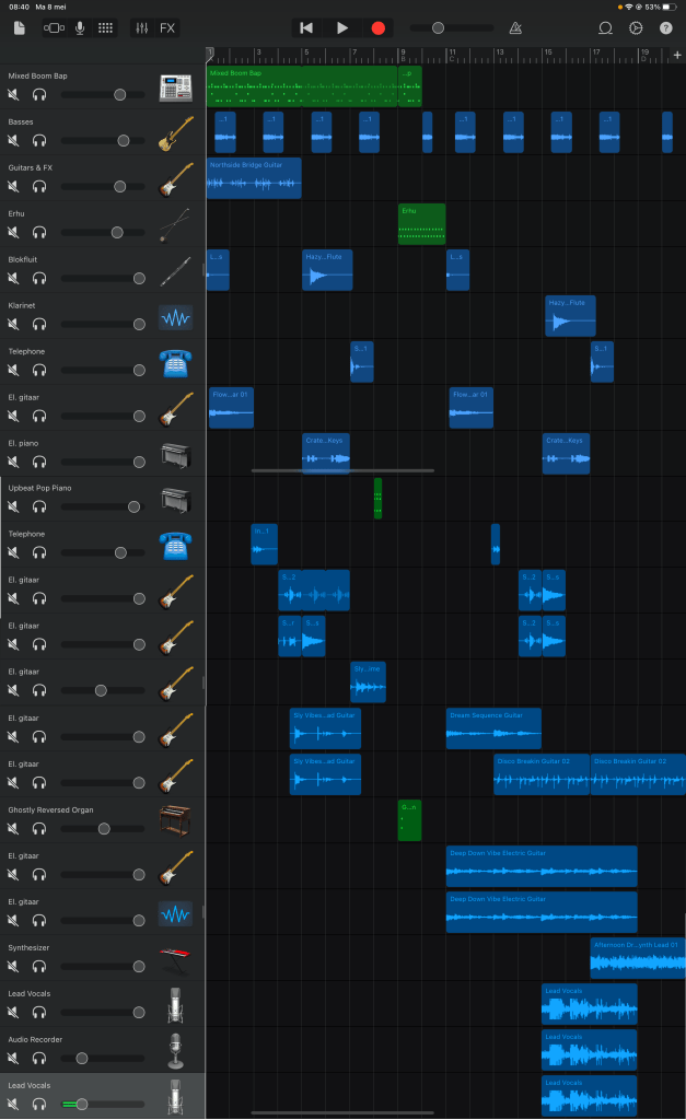 Om een indruk te geven hoe zo’n Garageband-compositie er aan de achterkant uitziet, onderstaand screenshot. Pnin Pnin heeft flink zitten knippen en plakken, zoals u ziet: korte samples, teruggeknipt tot 1 maat groot, gecombineerd met langere samples. Zitten knippen, plakken én schuiven, en dan hebben we het niet eens gehad over het zoeken en vinden van de juiste samples. Je bent zo drie tot vier uur bezig voor een minuut muziek…